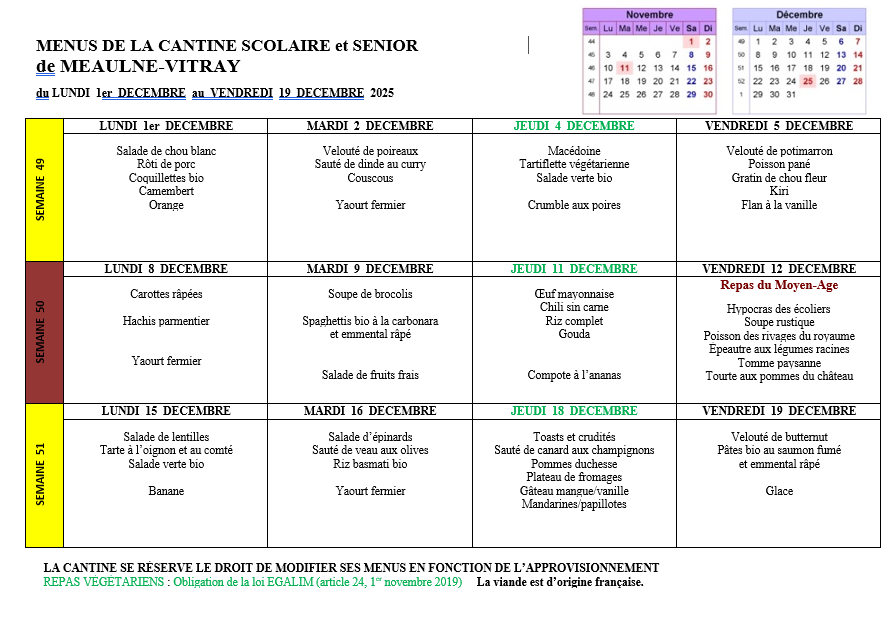 | MENUS DE LA CANTINE À SAVOIR : la cantine de Meaulne-Vitray utilise aussi souvent que possible des produits locaux ou bio. Repas végétarien (marqué en vert sur les menus) : obligation de la loi EGALIM art.24 depuis le 1er novembre 2019 |