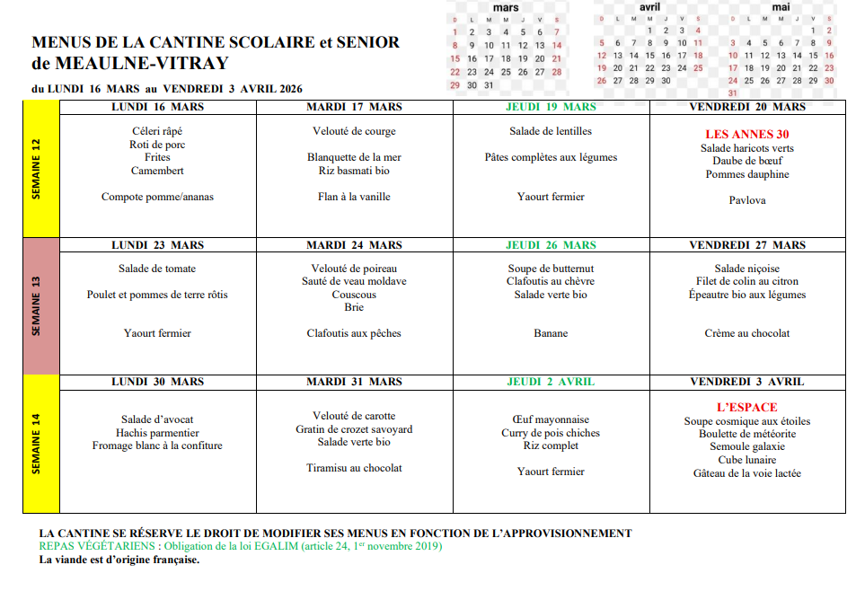 | MENUS DE LA CANTINE À SAVOIR : la cantine de Meaulne-Vitray utilise aussi souvent que possible des produits locaux ou bio. Repas végétarien (marqué en vert sur les menus) : obligation de la loi EGALIM art.24 depuis le 1er novembre 2019 Les semaines sont coloriées pour faciliter le choix des poubelles à sortir le dimanche soir précédent |
