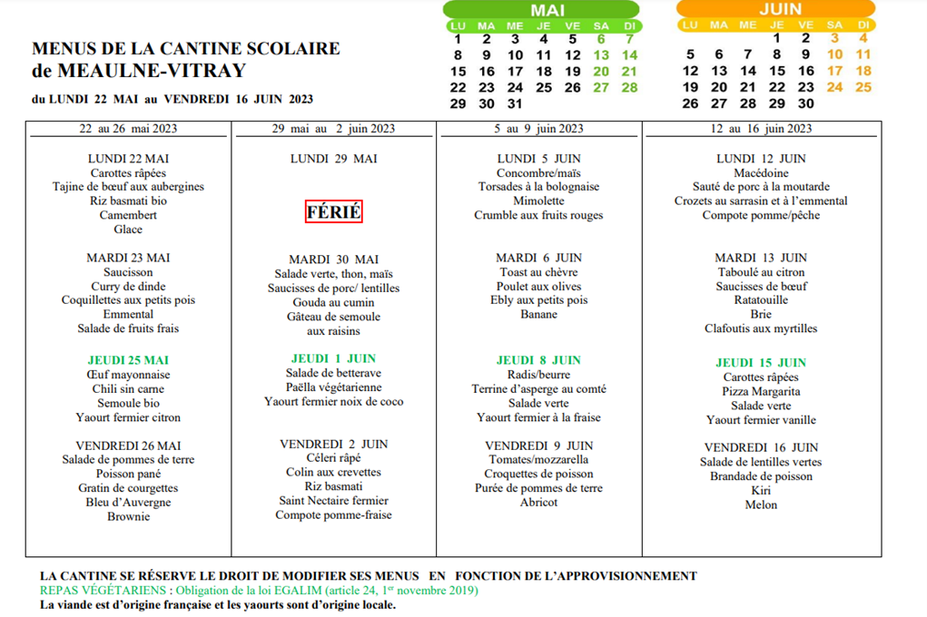 | MENUS DE LA CANTINE À SAVOIR : la cantine de Meaulne-Vitray utilise aussi souvent que possible des produits locaux ou bio. Repas végétarien (marqué en vert sur les menus) : obligation de la loi EGALIM art.24 depuis le 1er novembre 2019 |