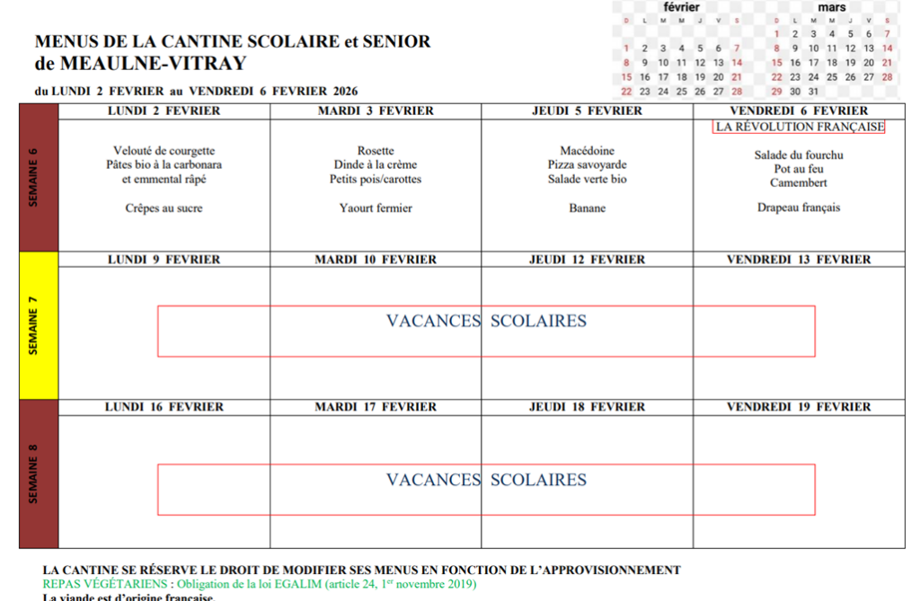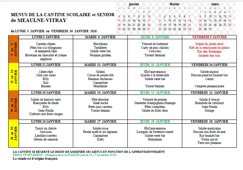 | MENUS DE LA CANTINE À SAVOIR : la cantine de Meaulne-Vitray utilise aussi souvent que possible des produits locaux ou bio. Repas végétarien (marqué en vert sur les menus) : obligation de la loi EGALIM art.24 depuis le 1er novembre 2019 Les semaines sont coloriées pour faciliter le choix des poubelles à sortir le dimanche soir précédent |